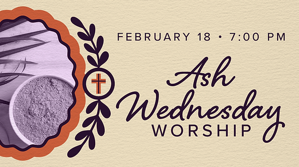 You're invited to start the Lenten journey on Ash Wednesday, February 18, with worship at 7:00 PM (in-person & live-streamed) and distribution of ashes.
